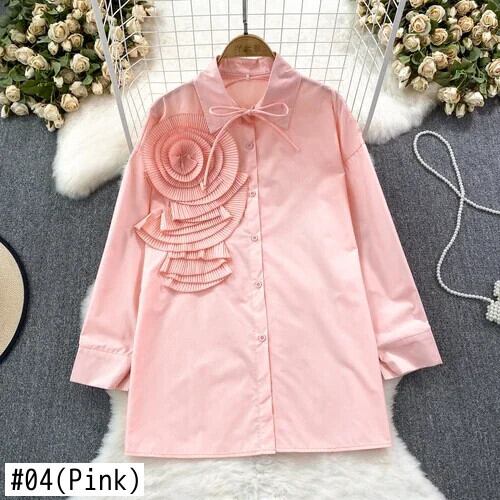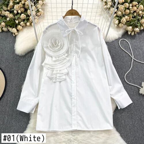 3D シャーリング大花シャツ長袖高級プリーツ花柄ブラウスストリートシングルブレストカーディガントップス ロング フラワーデザイン