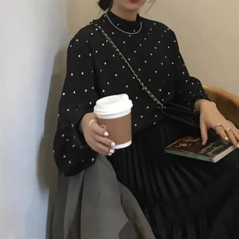 原宿シャツ黒白水玉シャツハーフネックルーズバブルスリーブ Tシャツ ホワイト ブラック かわいい