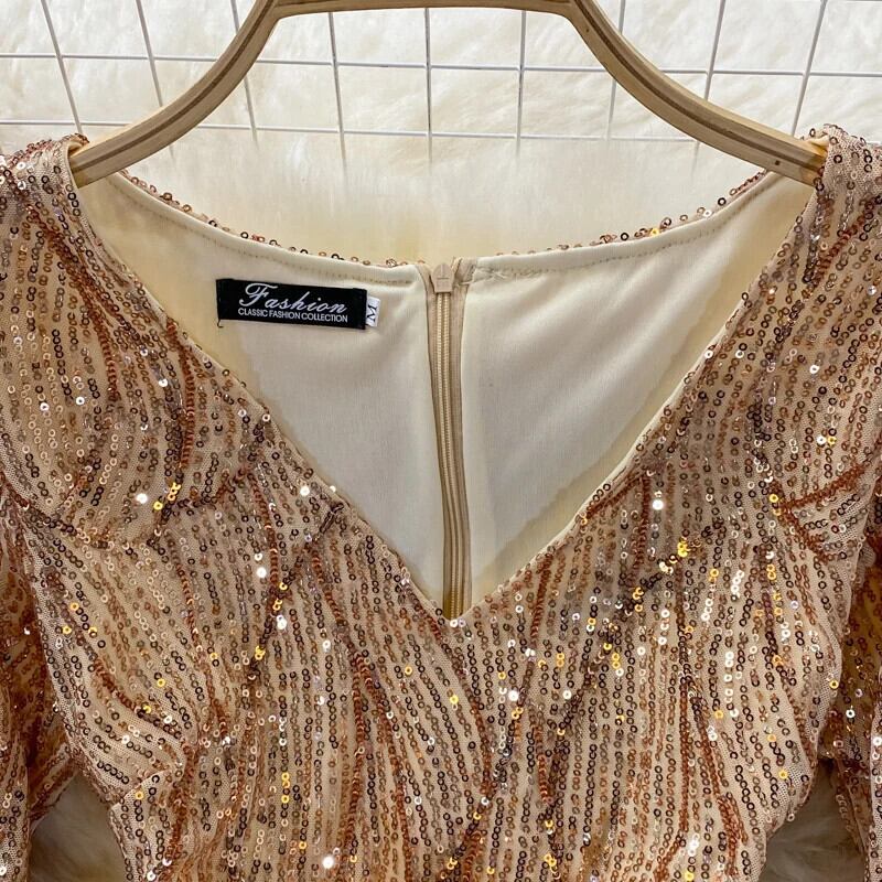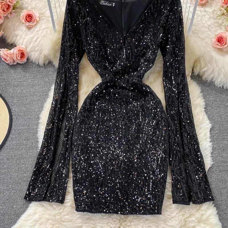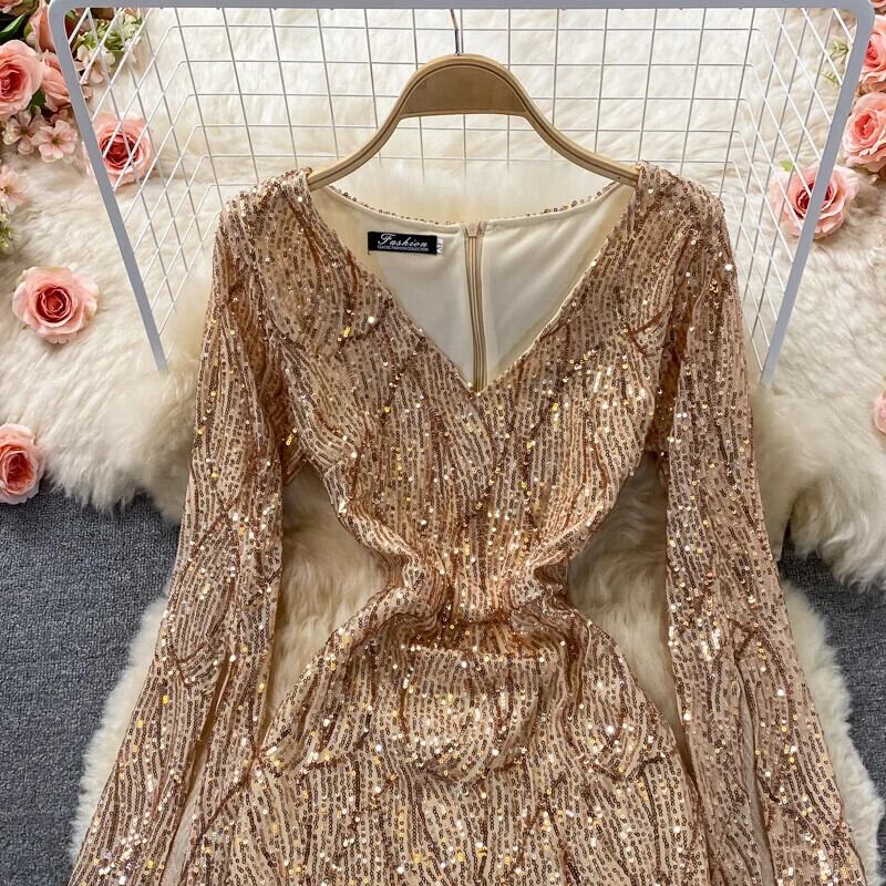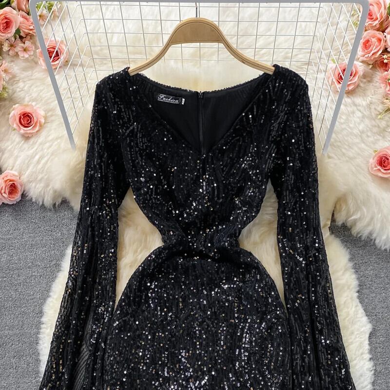 甘いスタイルスパンコールパッチワーク長袖ソリッドカラー A ラインセクシーヒップワープドレス秋ドレス V ネック ロング 大人ガーリー スウィート キュート カジュアル オータム 秋物 Vネック Aライン