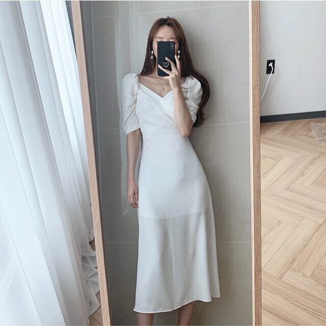 気質 V ネックウエスト痩身バブル半袖シフォンドレスサマードレスホワイトピンク A ライン Vestidos ショート ハーフスリーブ 夏物 Vネック Aライン