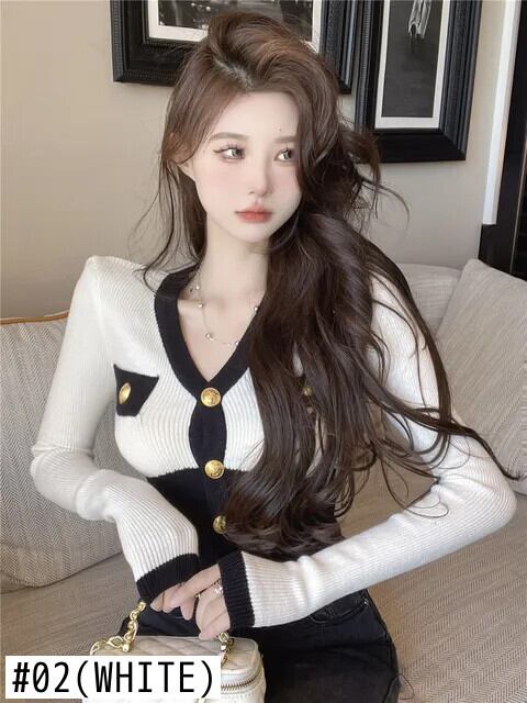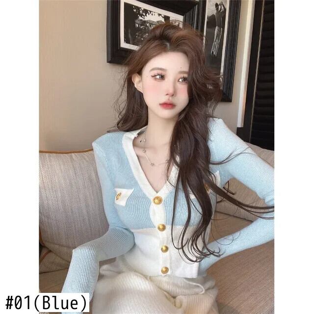 セータースリム秋 V ネックコントラストボトムタイトニット長袖トップクロップカーディガン黒プル ロング ブラック オータム 秋物 Vネック