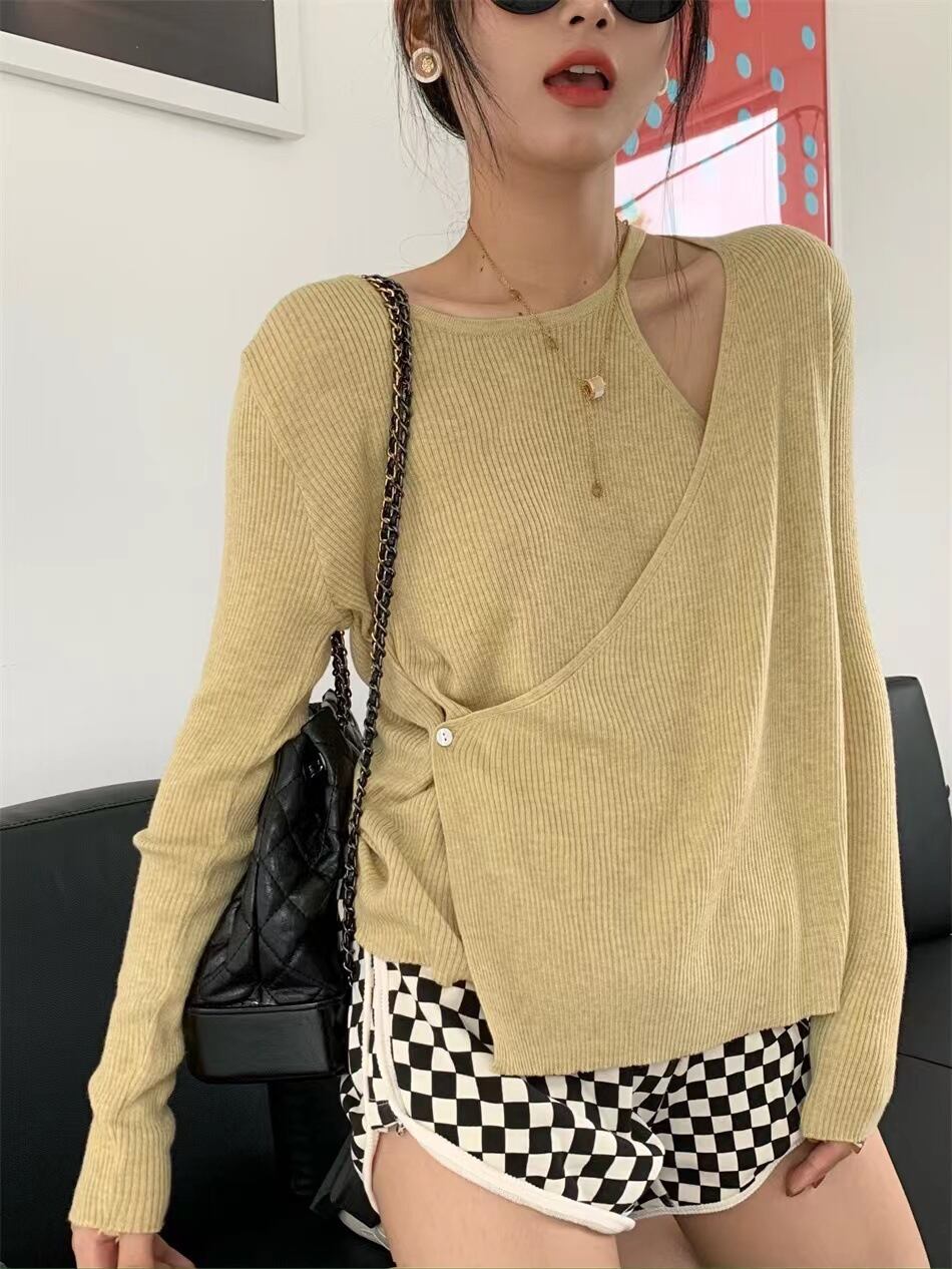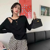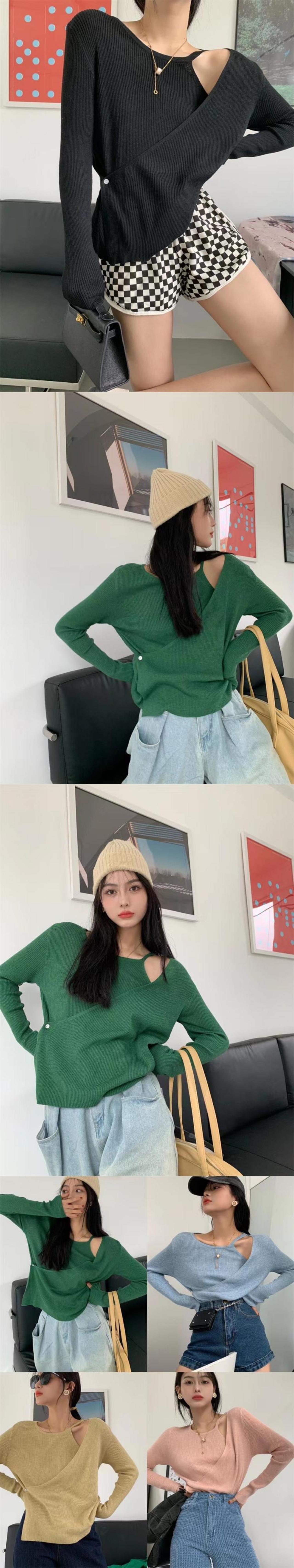 オフショルダー黒セクシー非対称シングルボトムセーター秋すべて一致ニットトップス長袖プルオーバーシャツ ロング ブラック シャツ オータム 秋物