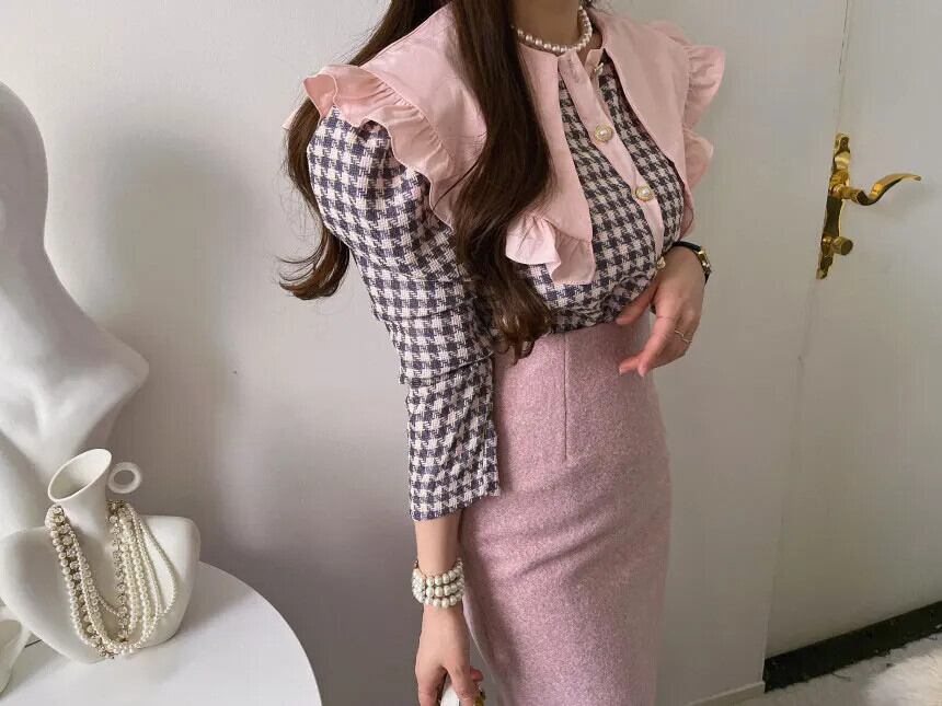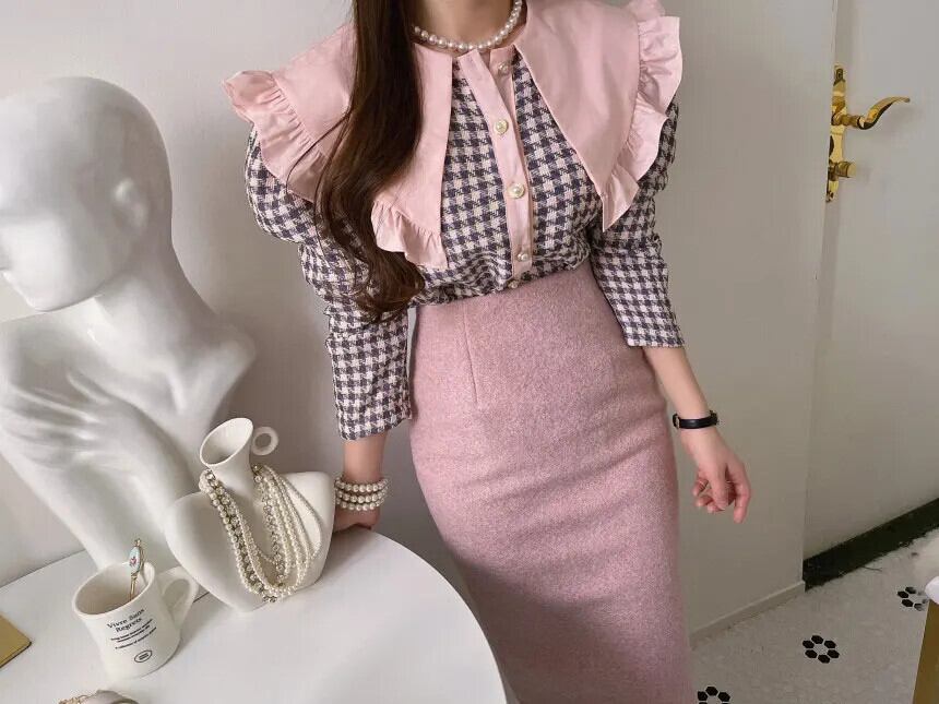 甘い大きラペル木製耳カラーコントラスト長袖千鳥チェック柄シャツピンクドールトップシャツ ロング 大人ガーリー スウィート キュート カジュアル