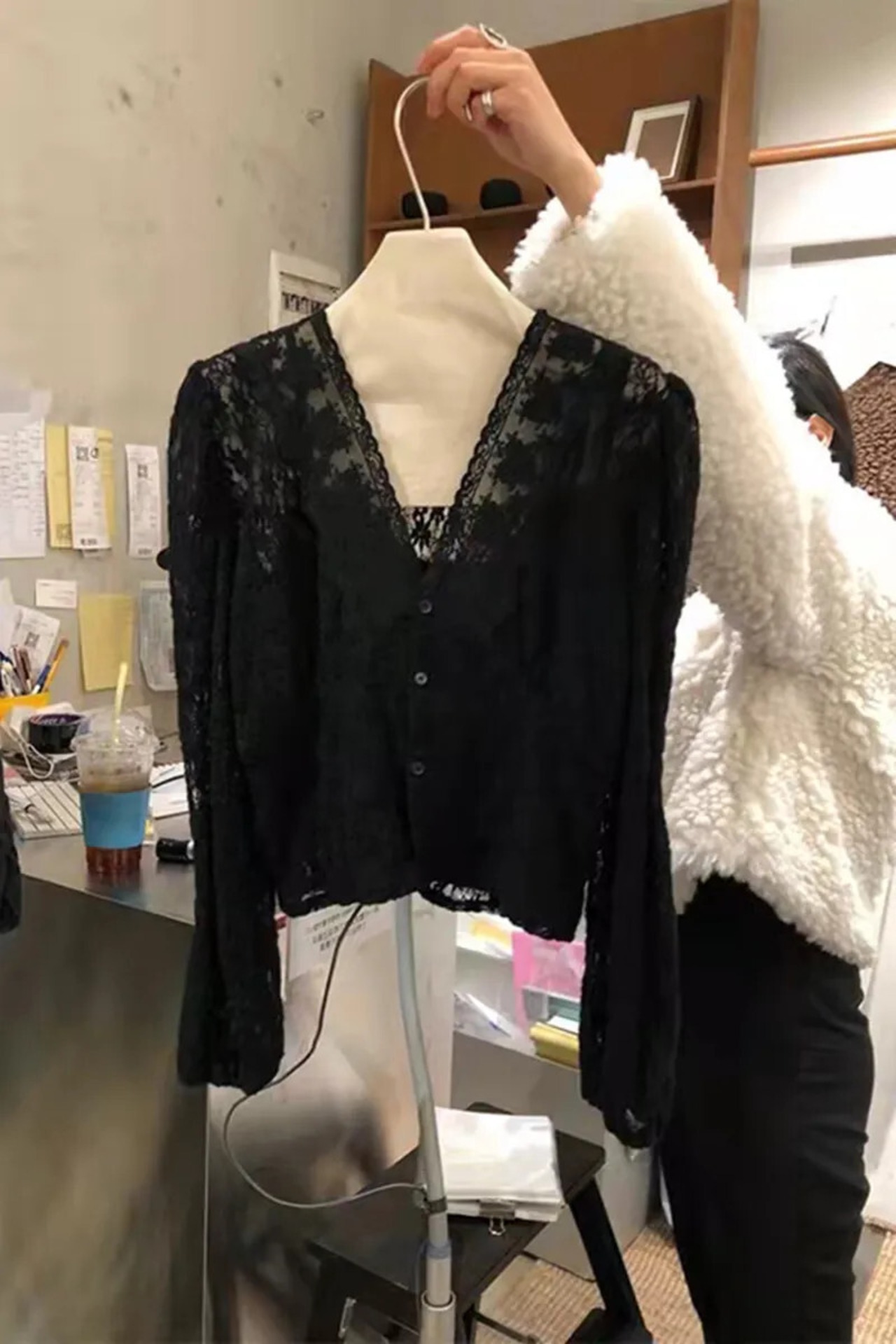 s es セクシークロップトップス V ネックシングルブレスト長袖ソリッドカラーボトムレースシャツ黒シャツブラウス ロング ブラック Vネック