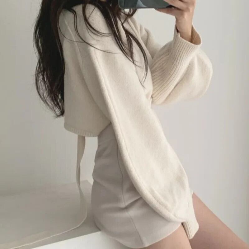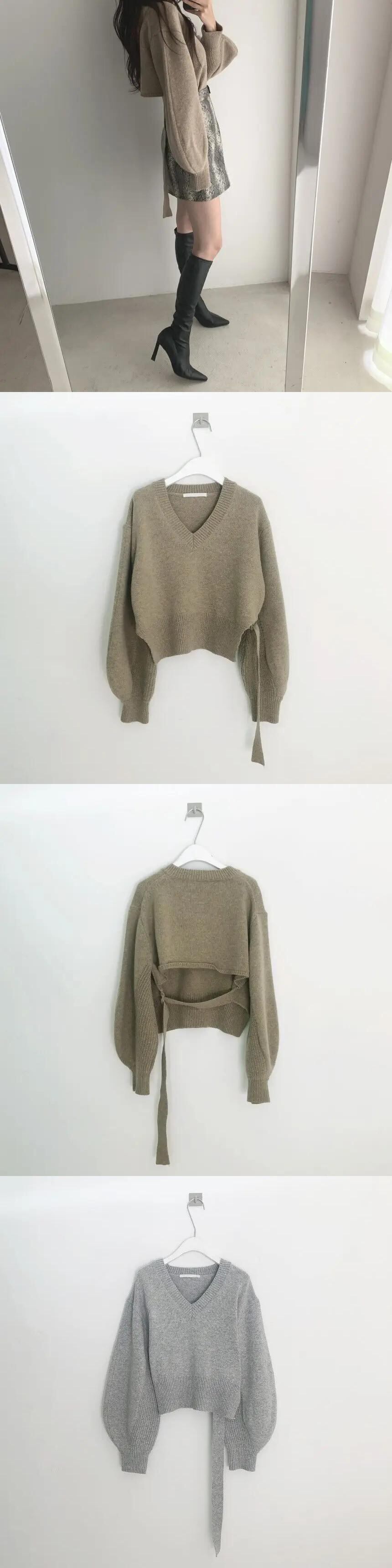 セーターオープンバックレースアップトップ V ネックセータールーズスリムランタンスリーブニット Y2k 黒グレー ブラック Vネック