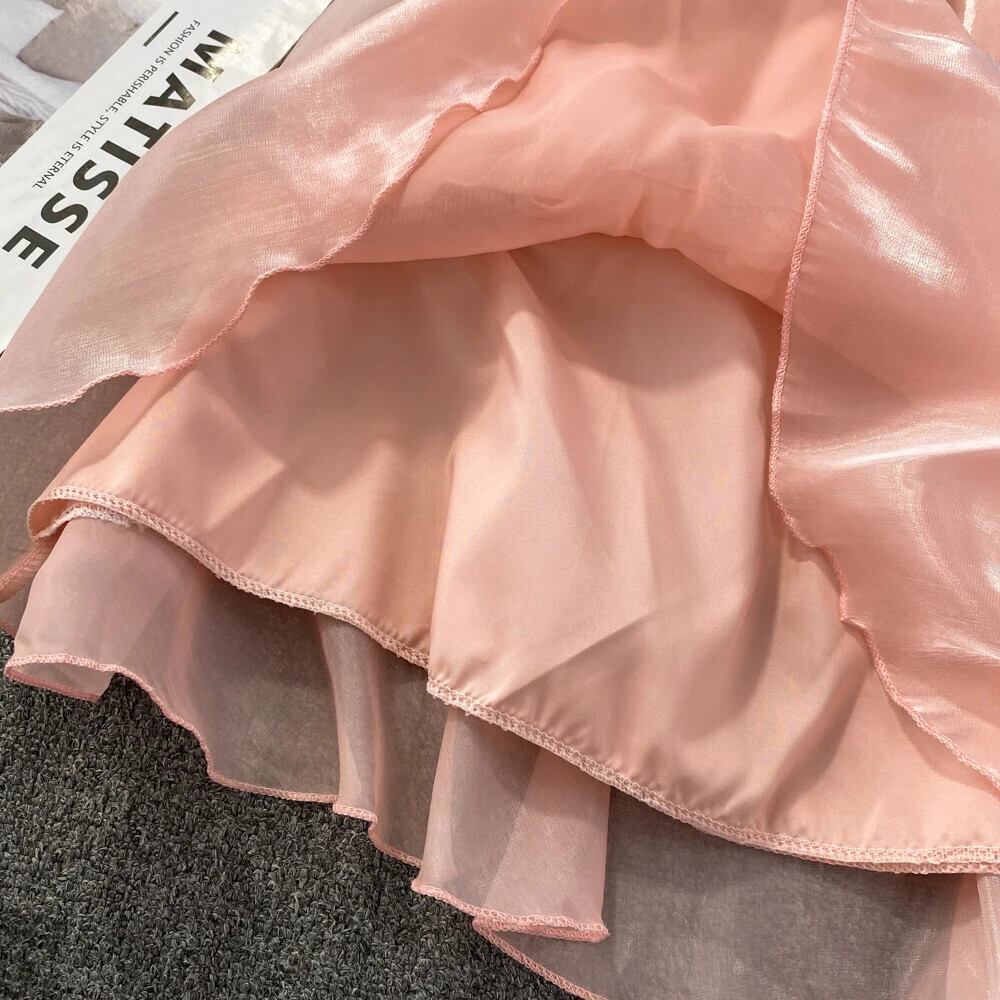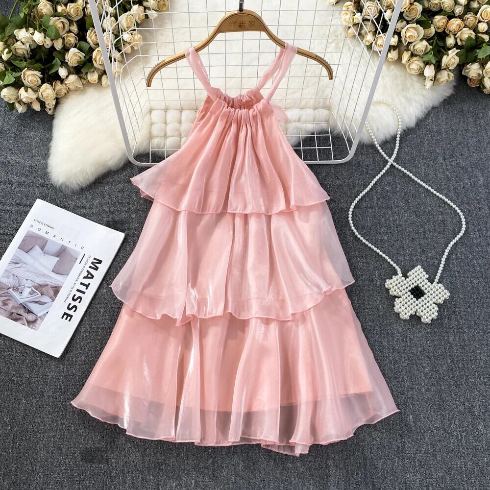 シック甘いホルターフリルパッチワークケーキドレスウエストドレスノースリーブ A ライン Y2K ラッフル 大人ガーリー スウィート キュート カジュアル Aライン