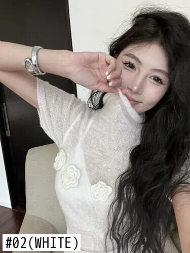 美的 Ropa グラフィック Tシャツ 3D フラワー半袖ネックニット薄型視点スリムフィットショートトップセーター ハーフスリーブ フラワーデザイン