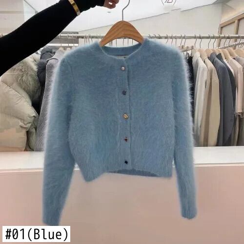 ラウンドネックカーディガン気質小さ香りよいミンクセータープルブルーカシミアトップスフリースコート Oネック