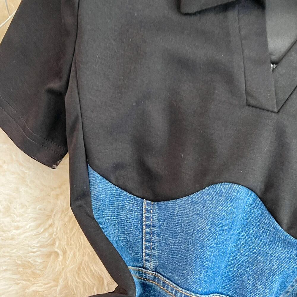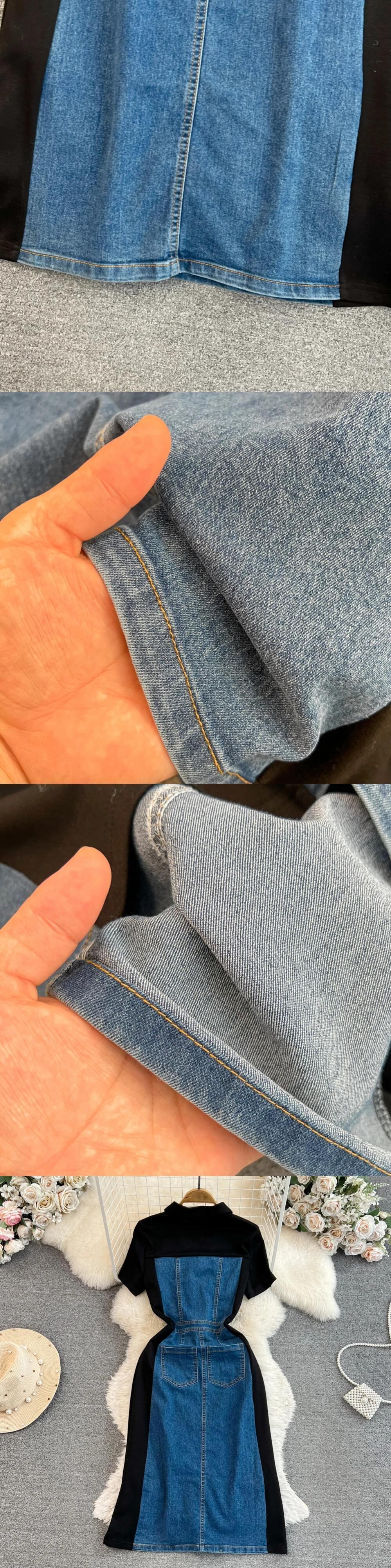 気質コントラストカラーパッチワークデニムドレス半袖 O ネックドレス夏 Y2k ショート ハーフスリーブ サマー 夏物 Oネック