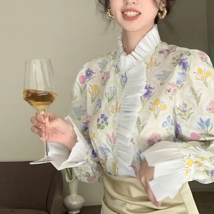 トップス春宮殿スタイル白シャツ菌花シャツ ホワイト レース スプリング 春物 フラワーデザイン