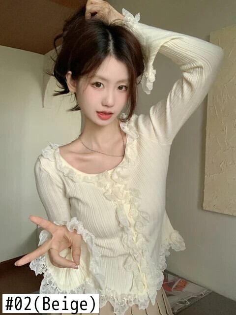 気質レース長袖セーター秋不規則フィットショートトップジャンパーフレアプルセーター黒セーター ロング ブラック オータム 秋物