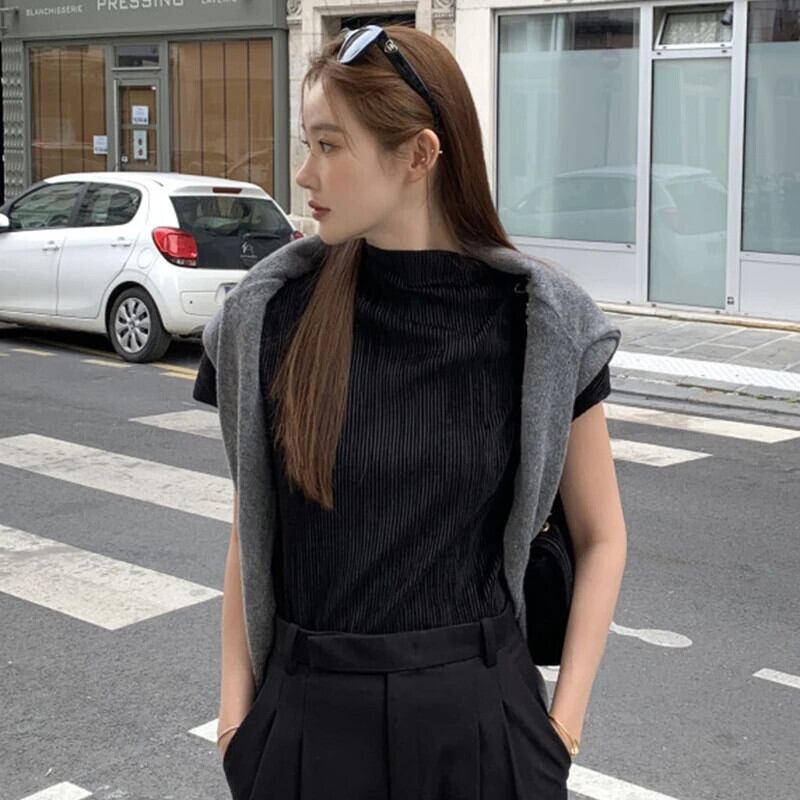 Tシャツソリッドノースリーブ Tシャツシックスリムショート Y2k トップ Tシャツハーフプリーツ ソリッドカラー