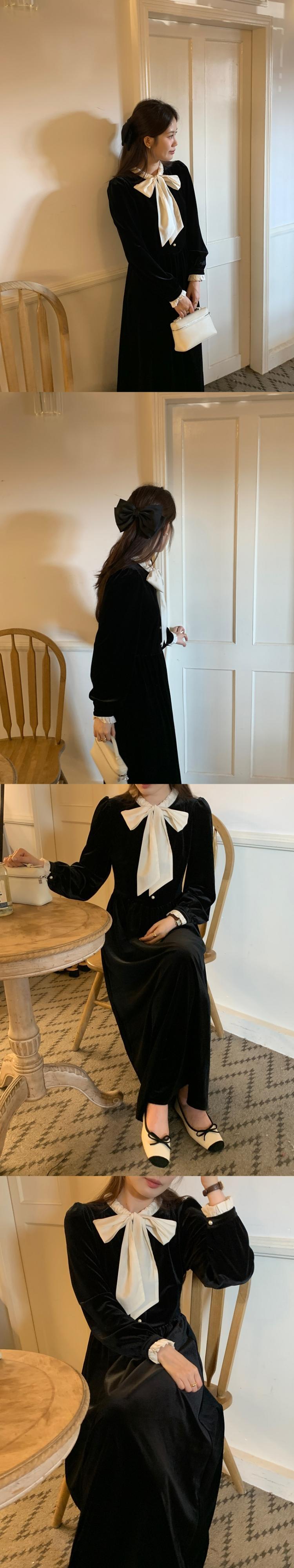 シック秋フレンチレースアップリボンコントラストカラーウエストスリムブラックベルベットドレスパーティーロングドレスクラブ オータム 秋物