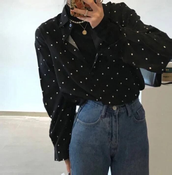 ルーパスブラウス Roupas スリーブトップスコントラストポルカドットシャツ春シャツ スプリング 春物