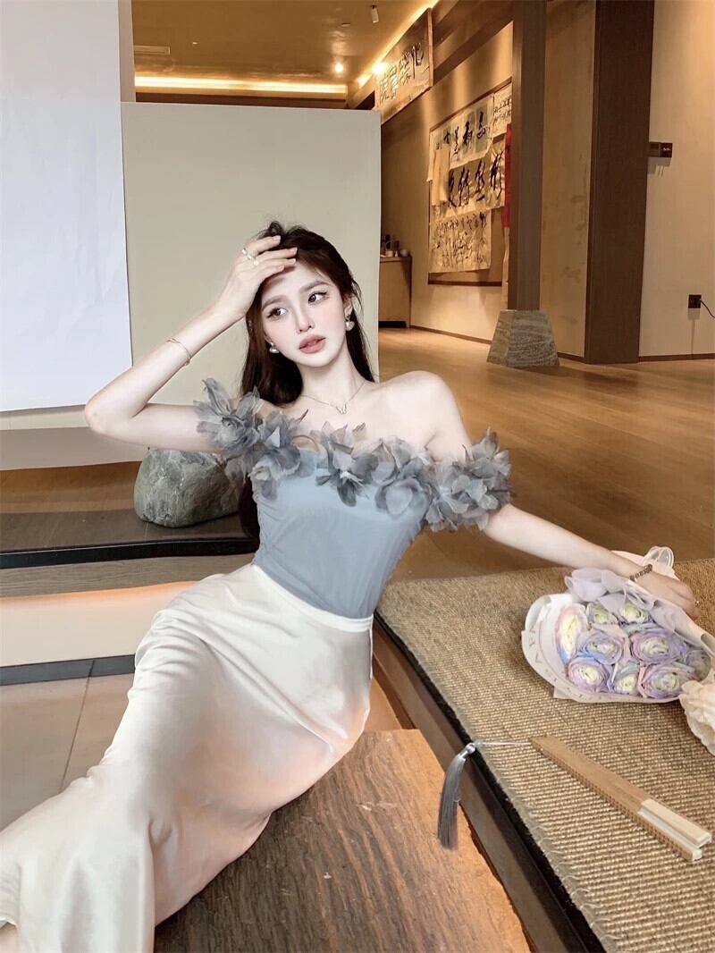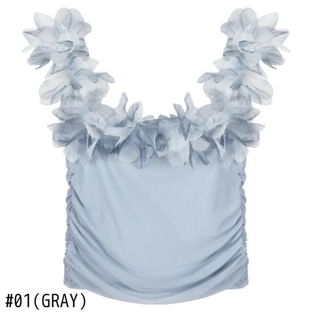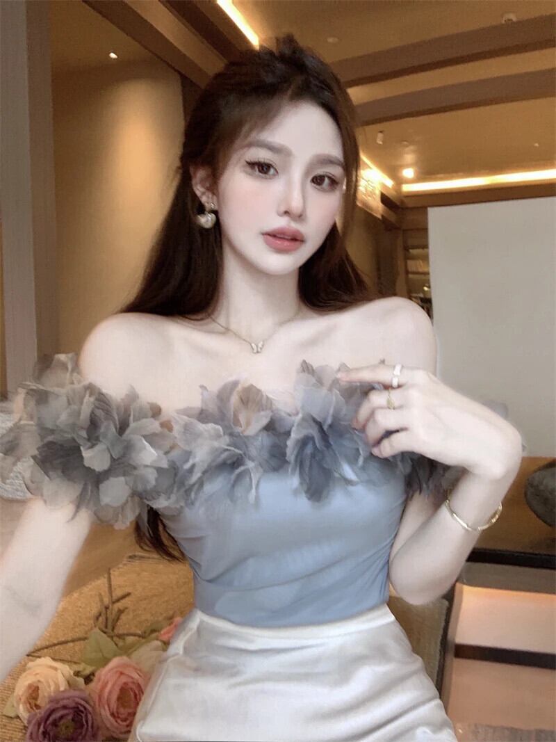 タンク & キャミソール セクシー ノースリーブ オフショルダー ショート トップ グレー 3D フラワー タンク トップ 春夏 ブラウス シック シャツ スプリング 春物 サマー 夏物 フラワーデザイン