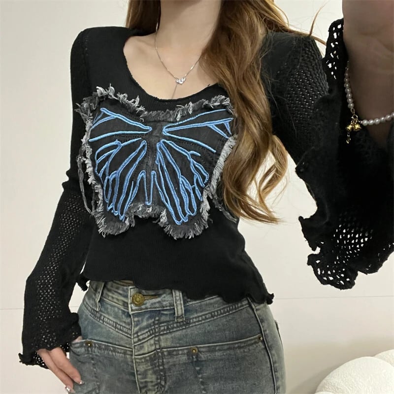 グラフィック Tシャツ クロップトップ Y2k フェアリーコア美学グランジ フレア袖スウィート ガール ボウ蝶セーターセクシー Tシャツ Ropa フレアスリーブ リボン 大人ガーリー キュート カジュアル