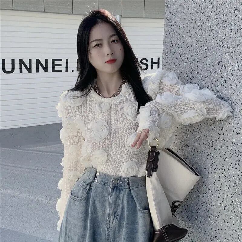 セーター春秋 3D フラワールース甘い O ネック女子セーターレースシャツセーター 大人ガーリー スウィート キュート カジュアル スプリング 春物 オータム 秋物 Oネック フラワーデザイン