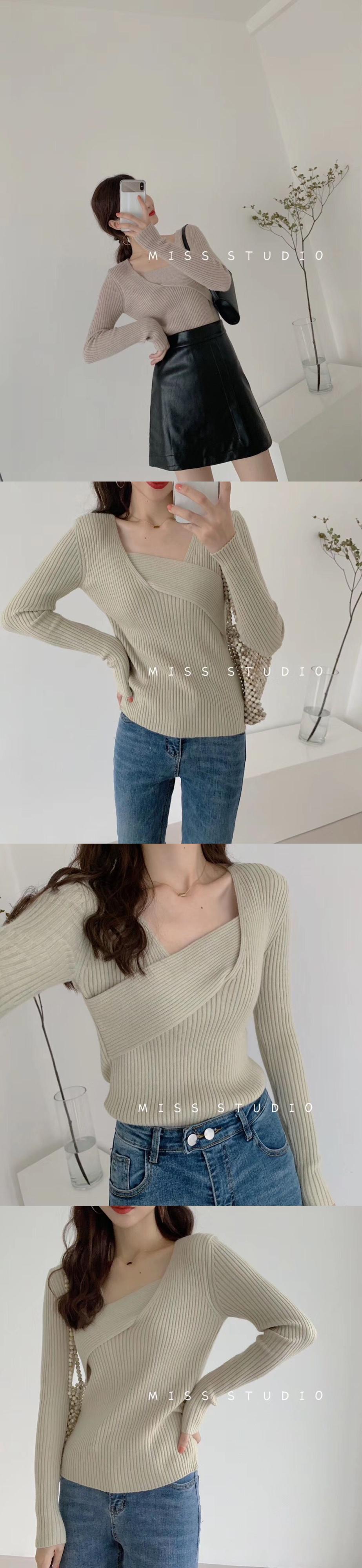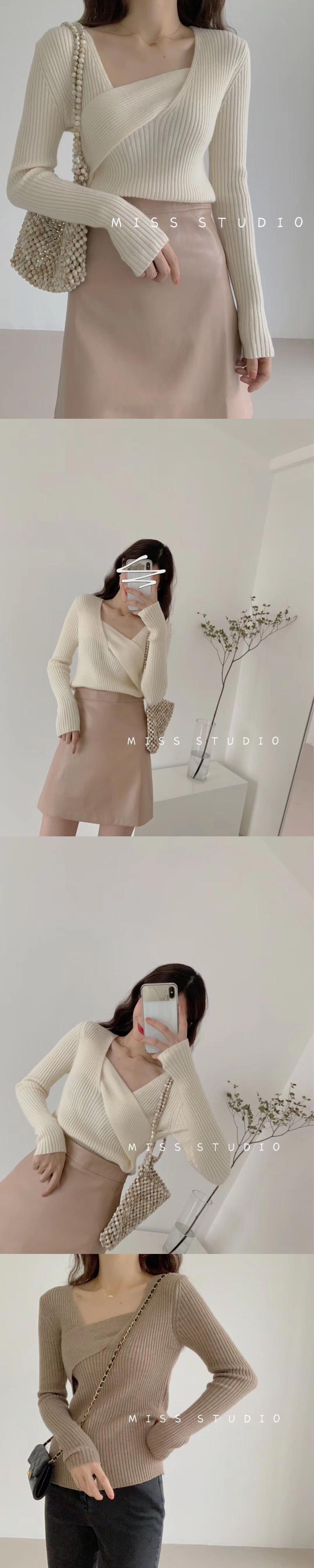 セーター気質斜め襟ジャージシャツスリムクロップトップスジャンパーボトムニットプルオーバーセーター