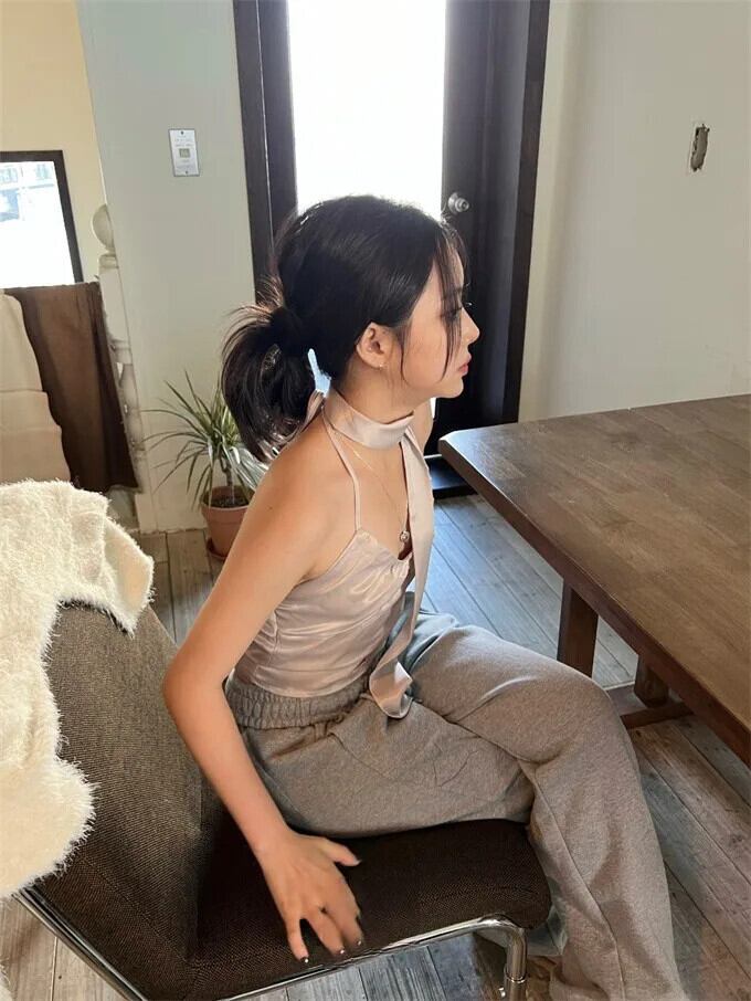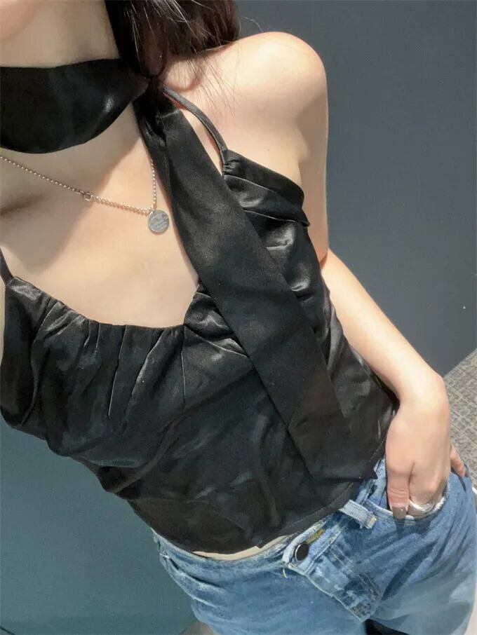 サテンキャミソール Kpop ホルタートップススカーフセットセクシー背中開いたキャミトップシックパーティートップス Tシャツ シルク