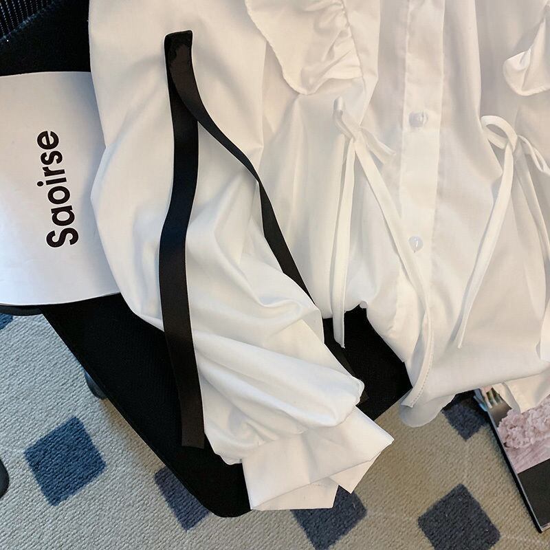 フレンチフリル花長袖シャツ春ルーズコートスタイルトップ白シャツシックブラウススタイル ロング ホワイト スプリング 春物 花柄