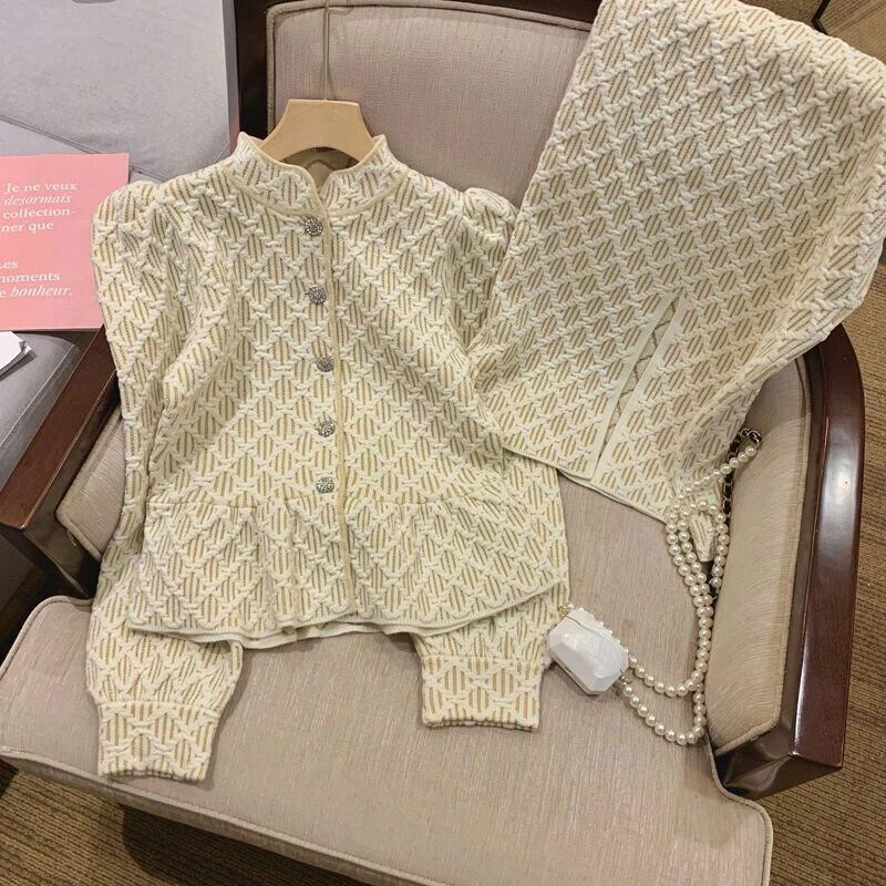 ジャカードスタンドカラーカーディガンニットツーピースセットニッチレトロ小さフレグランススーツ秋作物ジャケットAラインスカートセット オータム 秋物