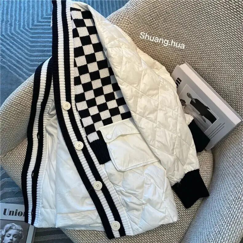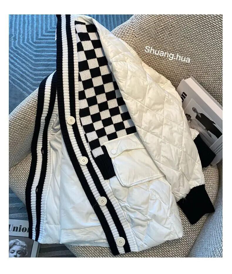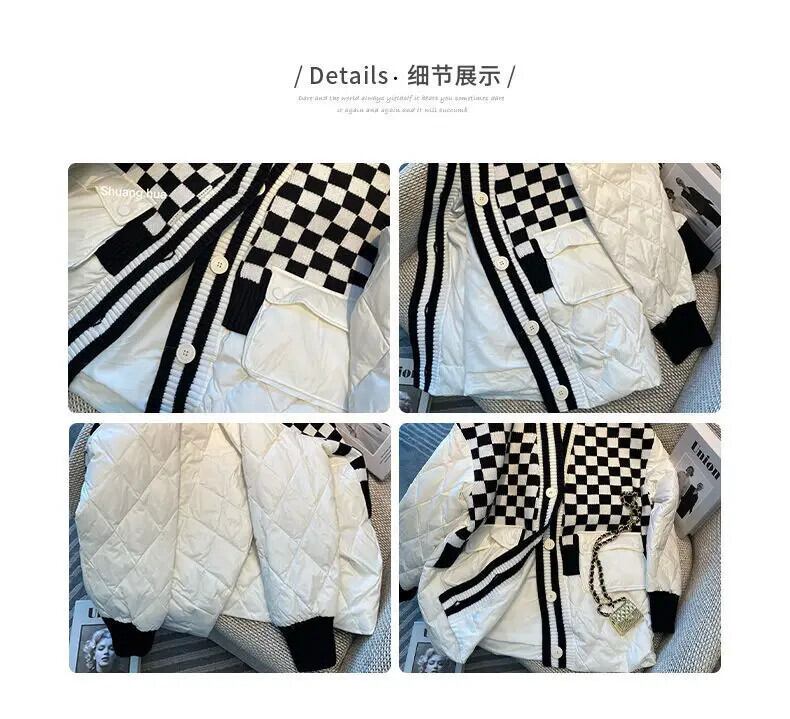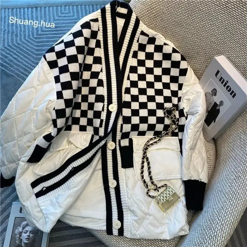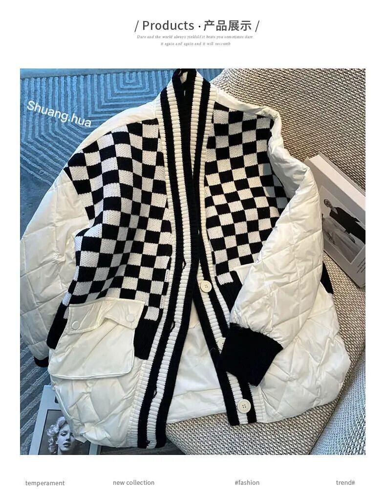 V ネックパッチワーク冬ストリート Y2k 市松ジャケットパーカー Chaquetas 綿チェック柄コートトップ コットン ウィンター 冬物