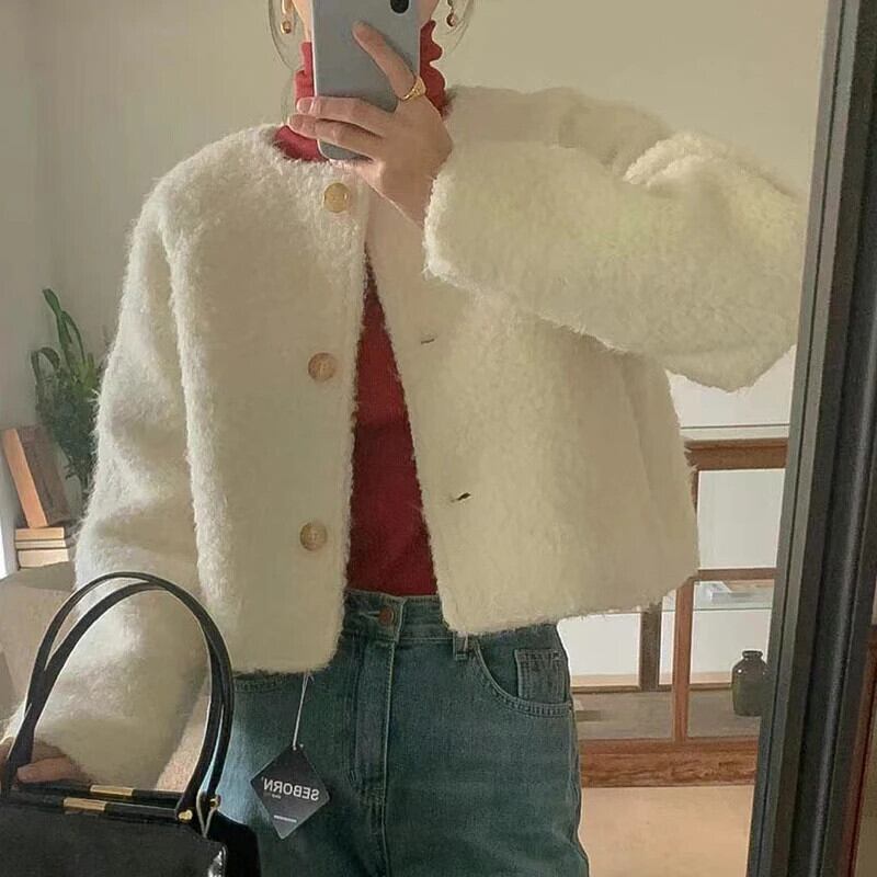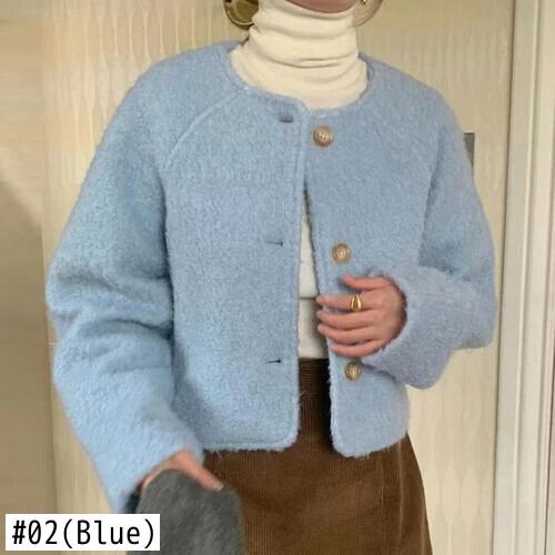 ブルー優しいラウンドネックメタルボタンルーズ長袖ウールジャケットチャケータシック冬トップコート ロング ウィンター 冬物 Oネック