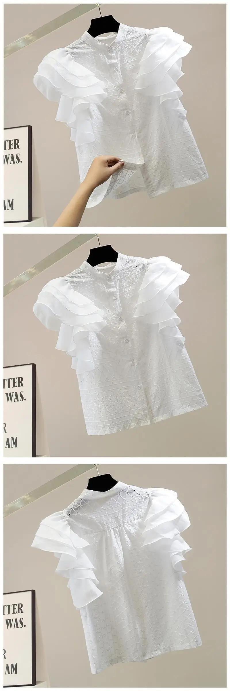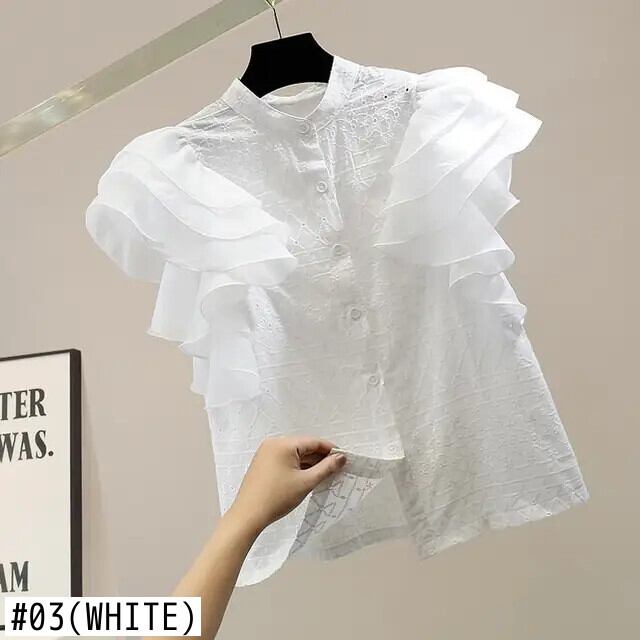 ヘビー刺繍コットンフリルフライングスリーブスタンドカラーシャツサマーシャツドールブラウス 夏物