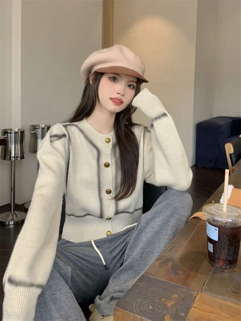 Y2k クロップド カーディガン トップス ルーズ ショート コントラスト セーター 小さ長袖ニット カーディガン プル コート ロング