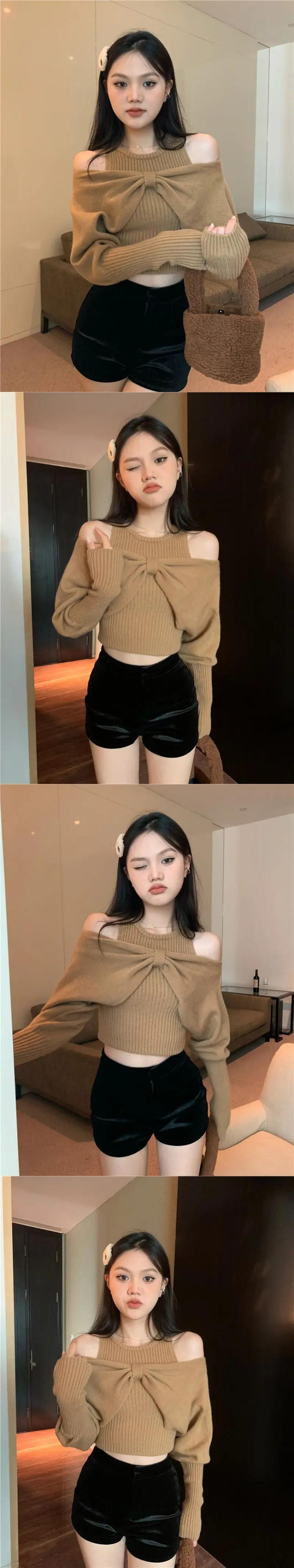 ラウンドネックオフショルダーセーター弓ソリッドカラーニットセーターバット長袖ショートスリムセーター ロング リボン Oネック