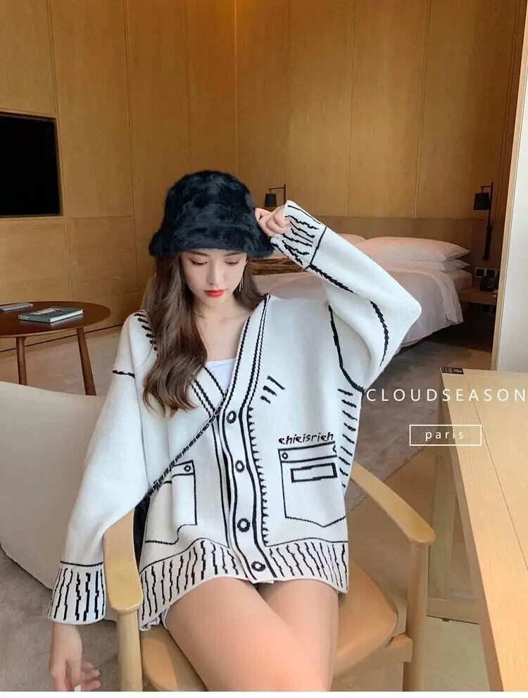 Y2k 原宿黒、白セーター上着ルーズストリートニットカーディガントップグラフィティコート ホワイト ブラック かわいい