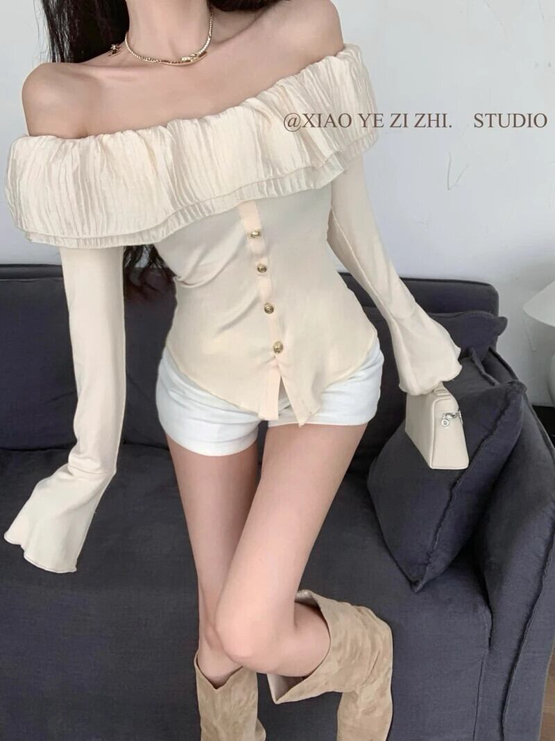 グラフィック Tシャツ美的 Y2k ショートトップスフリルオフショルダーフレアスリーブ黒 Tシャツ秋スタイルスリムセーター ブラック オータム 秋物