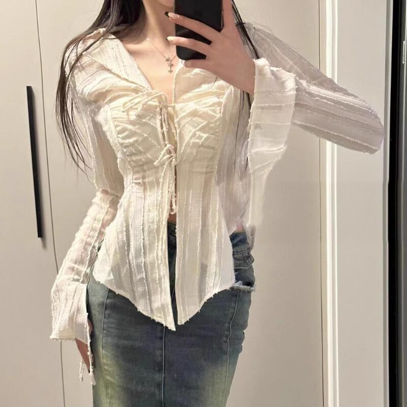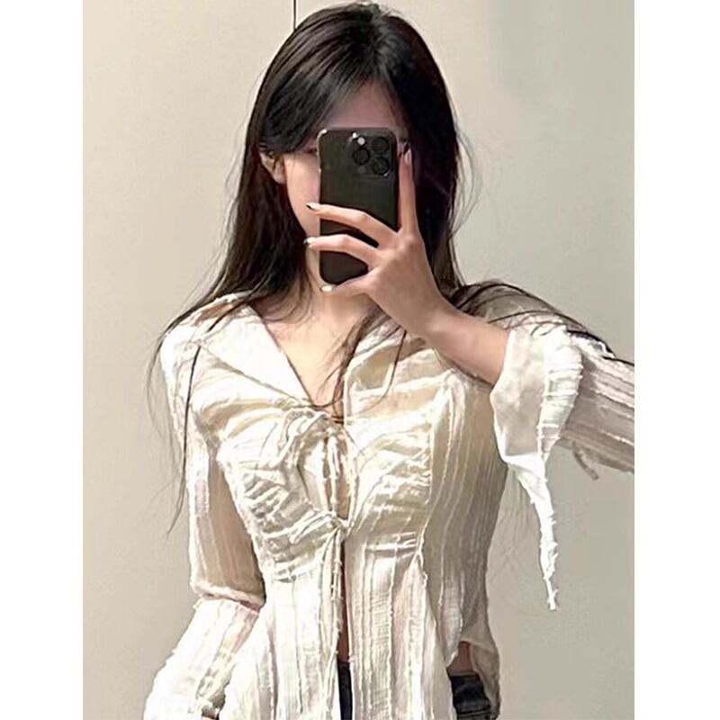 Fairycore レースアップブラウス長袖春ターンダウンカラーシャツトップスシフォン日焼け止め ロング スプリング 春物