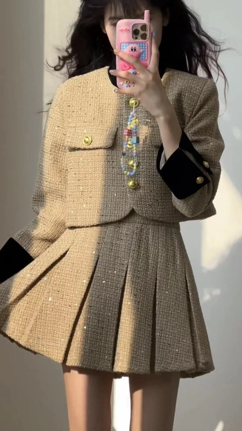 スーツ秋プレッピースタイル小さ香りよいプリーツスカート段段段ブラックウールコートシックトップ生き抜く 2 セット オータム 秋物 2セット