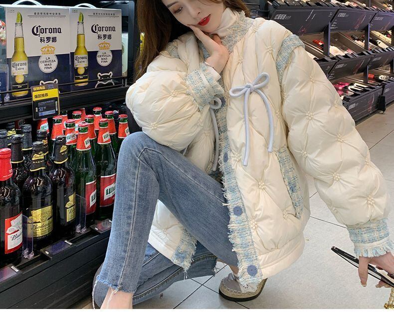 厚いツイードジャケット秋冬シックパファージャケットアーガイル弓チェック柄パーカー Chaquetas パラコート リボン オータム 秋物 ウィンター 冬物