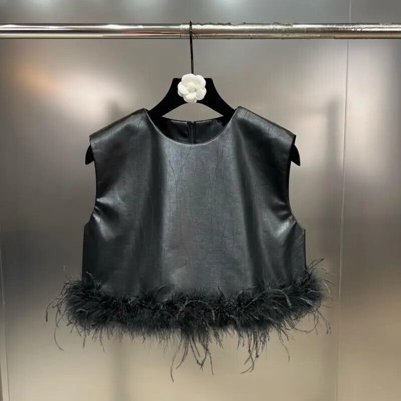 黒タンクトップフェザーノースリーブステッチ装飾ダークスタイル Y2k Tシャツクロップトップ Ropa グランジキャミソール ブラック