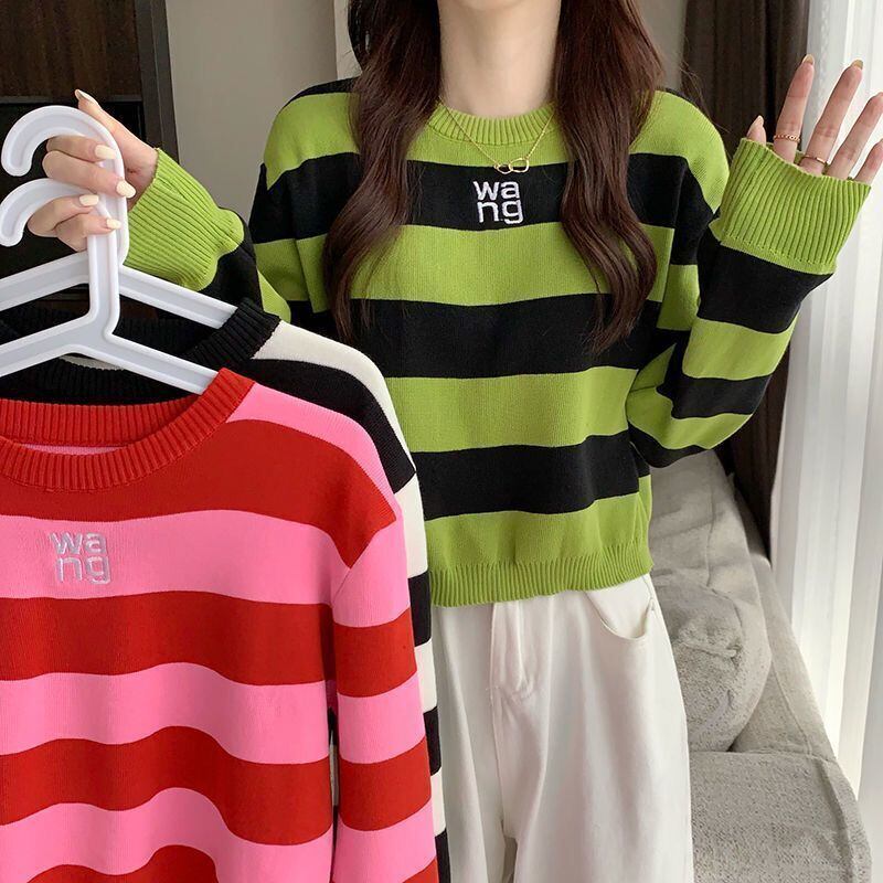長袖トップルーズ Y2k セーター赤ストライプセータープルジャンパープルオーバーニットレターセーター怠惰 ロング レッド