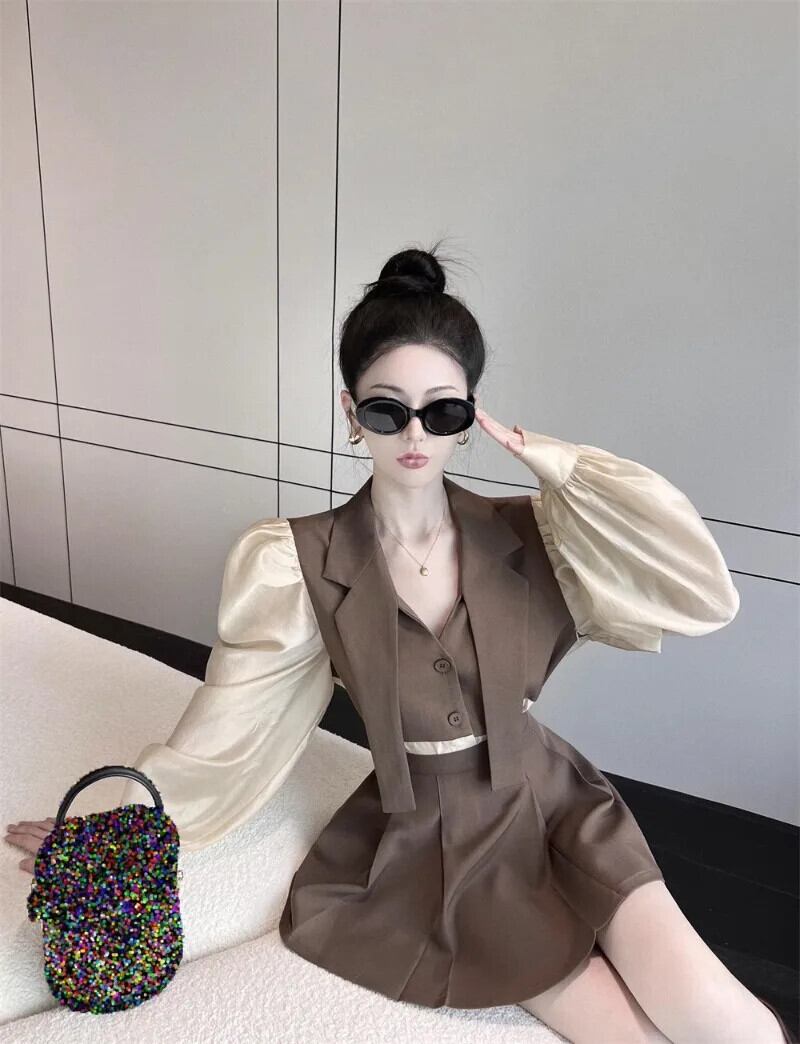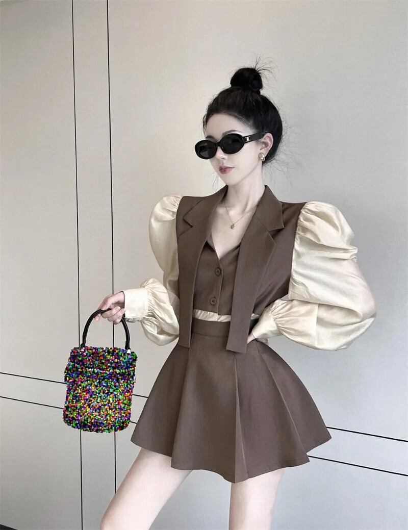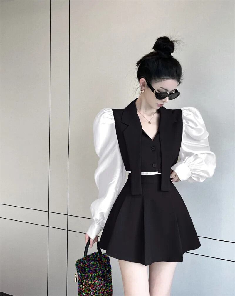 スカートスーツセクシー黒プリーツスカートスカートセット Y2k クロップグレーブレザーパフメッシュシャツ偽 2 コート秋 ブラック