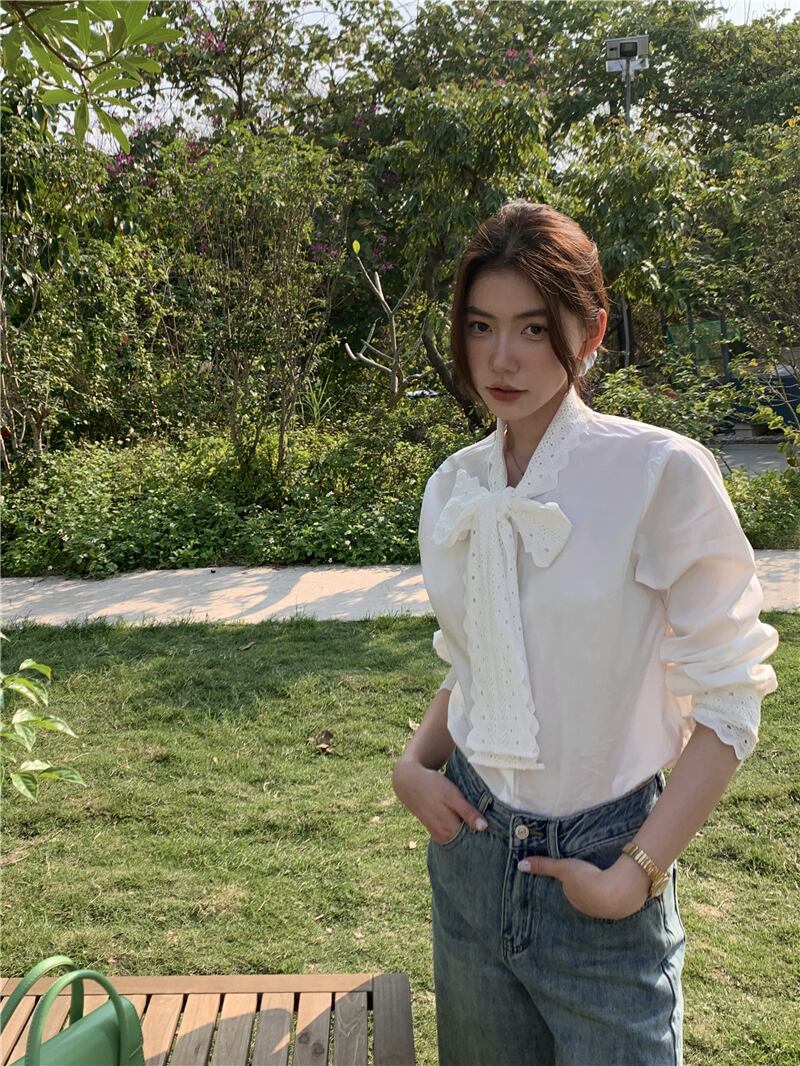 ちょう結びフレンチコートスタイル長袖シャツレディース秋白シャツブラウス ロング ホワイト リボン オータム 秋物