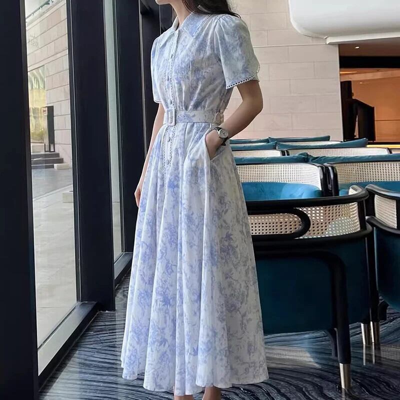 プリントレースアップドレスシングルブレスト気質コントラスト半袖ドレス夏ローブベルト ショート ハーフスリーブ サマー 夏物 ハーネス