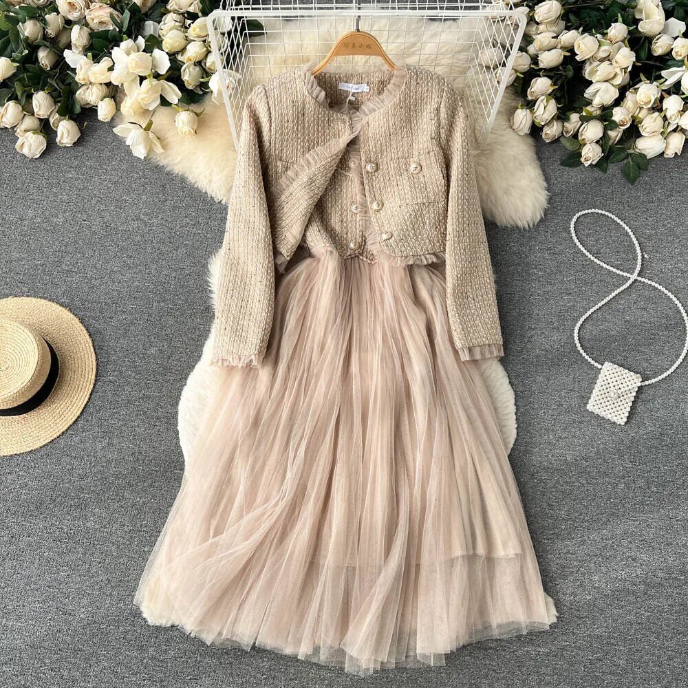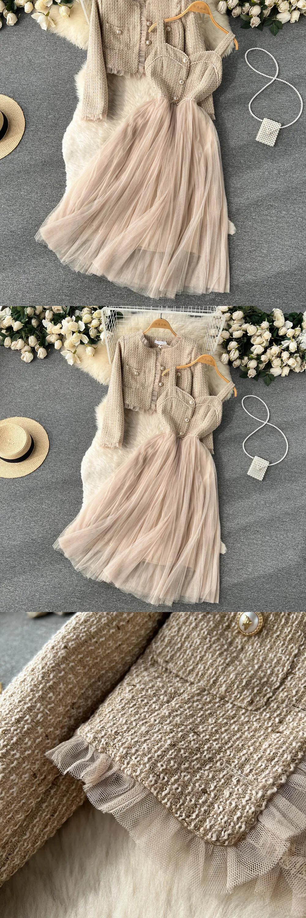 OL レトロセットシニアショートカーディガンコートトップスキャミソールメッシュロングスカートストリート冬 2 ピーススーツドレス ウィンター 冬物