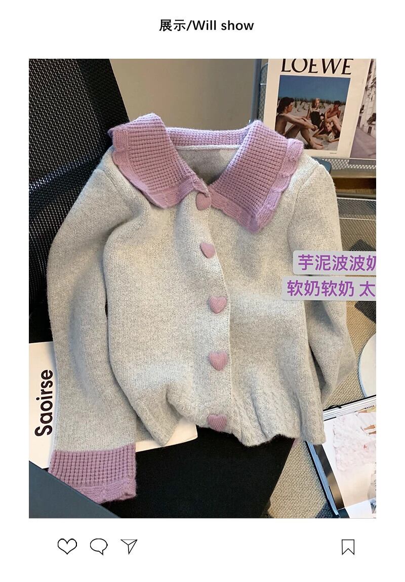 甘いピーターパン襟ハートボタンカーディガンセーターヒットカラー長袖ニットかわいいルーズトップ ロング 大人ガーリー スウィート キュート カジュアル