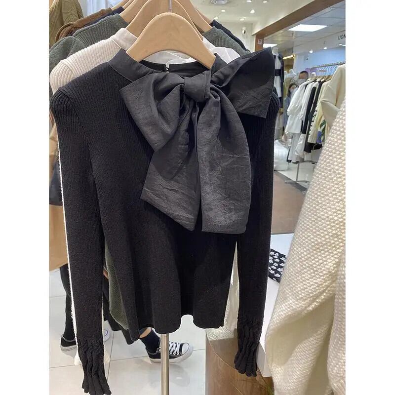 甘いニットセーター秋リボンちょう結びボトムシャツフレア袖ストレッチスリムトップス秋ニットプルオーバー フレアスリーブ 大人ガーリー スウィート キュート カジュアル オータム 秋物
