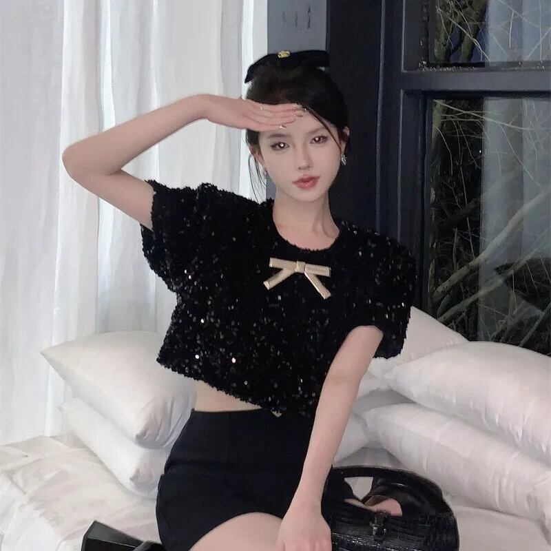 グラフィック Tシャツ Ropa 美的グランジ原宿クロップトップスパンコールリボン半袖 Tシャツ黒 ショート ブラック ハーフスリーブ かわいい