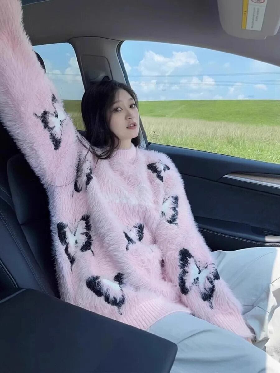 肥厚レイジーピンクバタフライセーターセーターデY2kプルジャンパーオーバーサイズトップス
