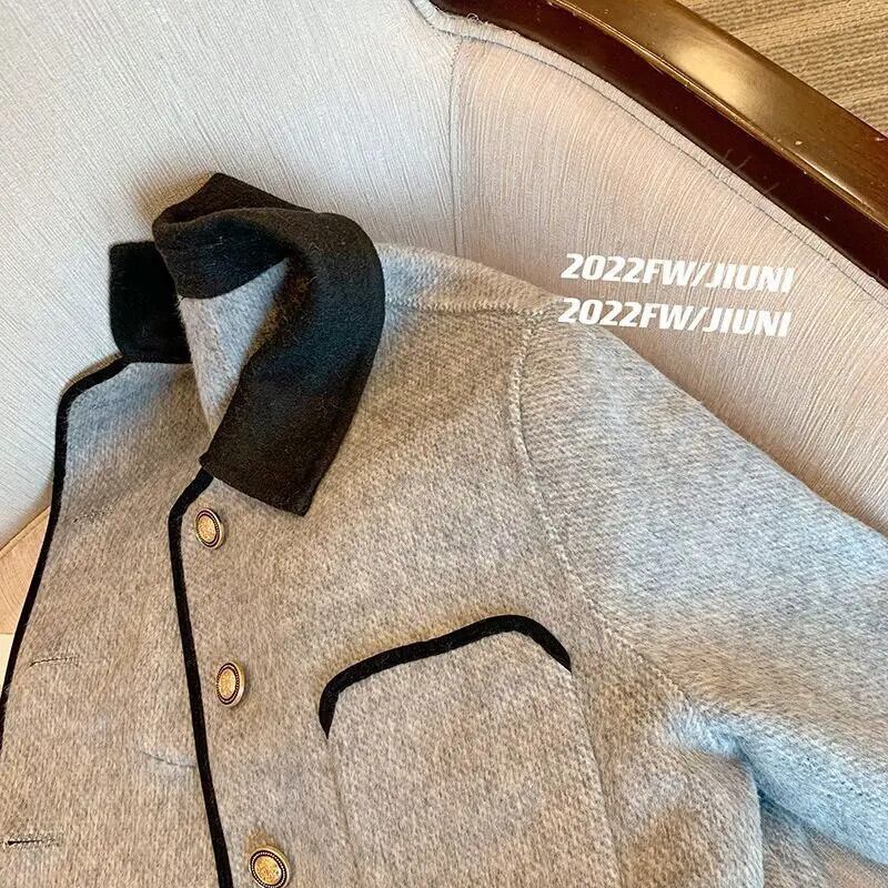 ショートグレーキルティングコートコントラストラペルウールジャケット冬原宿 Jaquetas Chaqueta トップ かわいい ウィンター 冬物