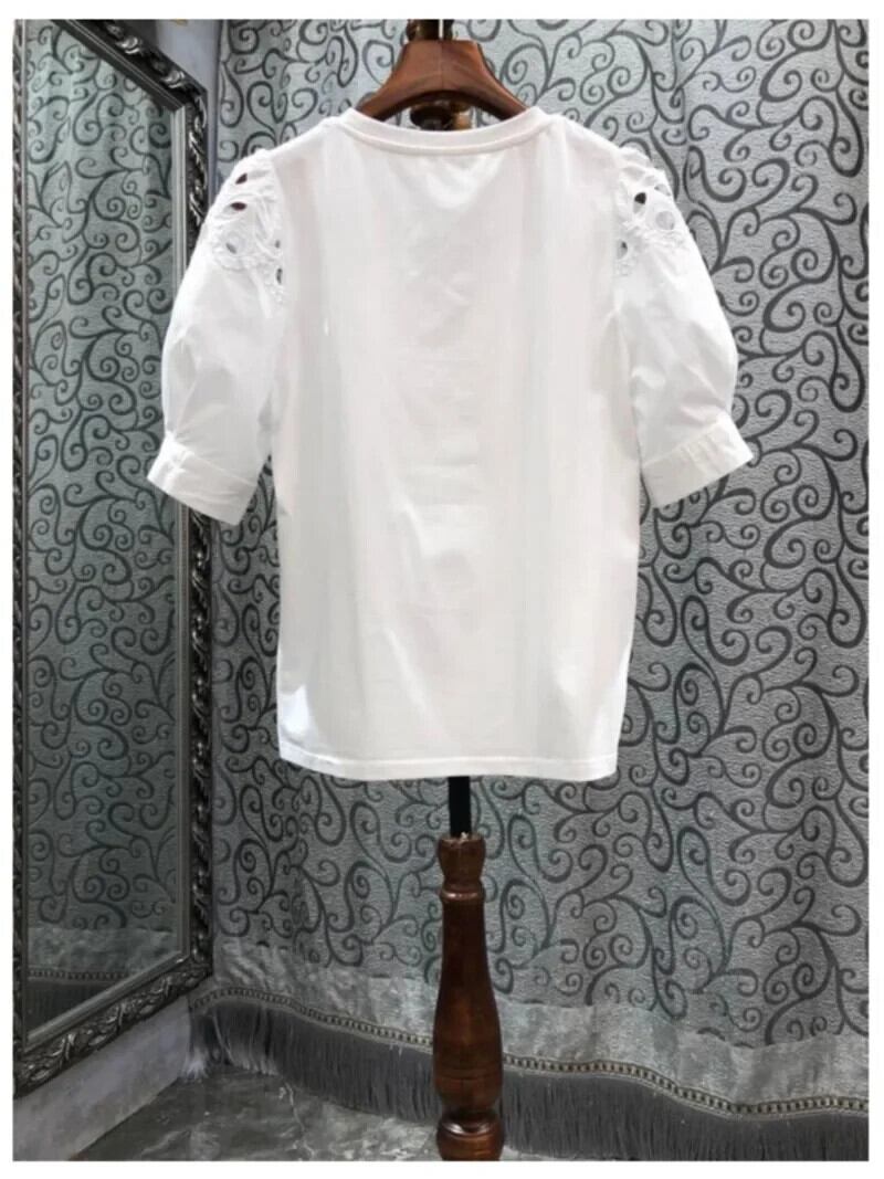 レース刺繍白ブラウス夏トレンディ O ネック半袖コットンシャツスイートシックトップ T シャツ ショート ホワイト ハーフスリーブ 大人ガーリー スウィート キュート カジュアル サマー 夏物 Oネック Tシャツ