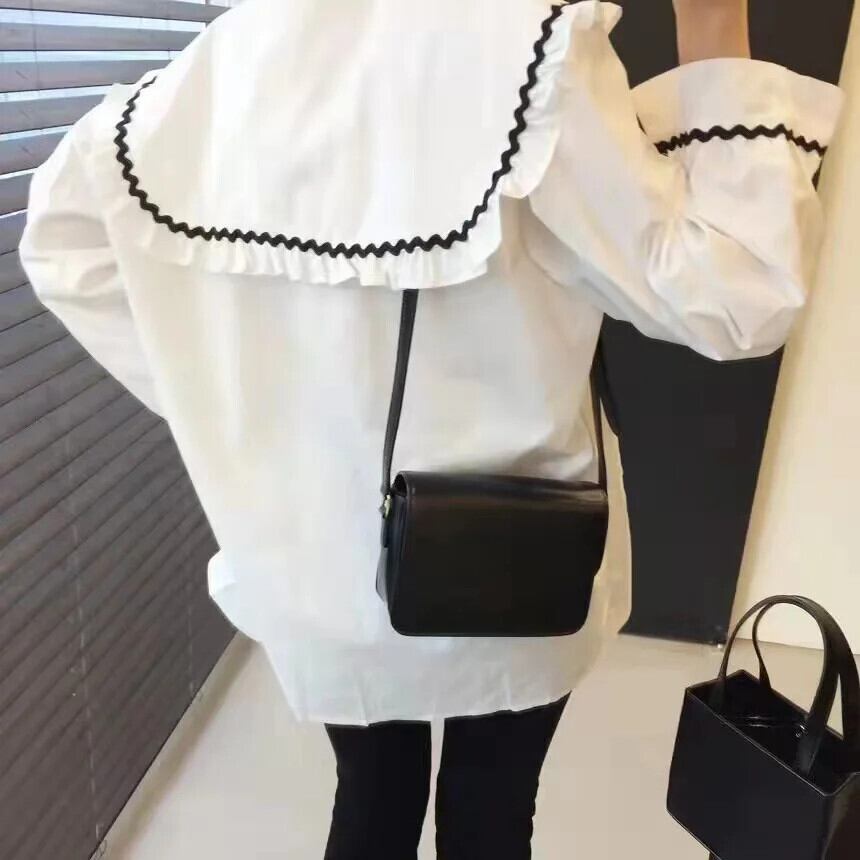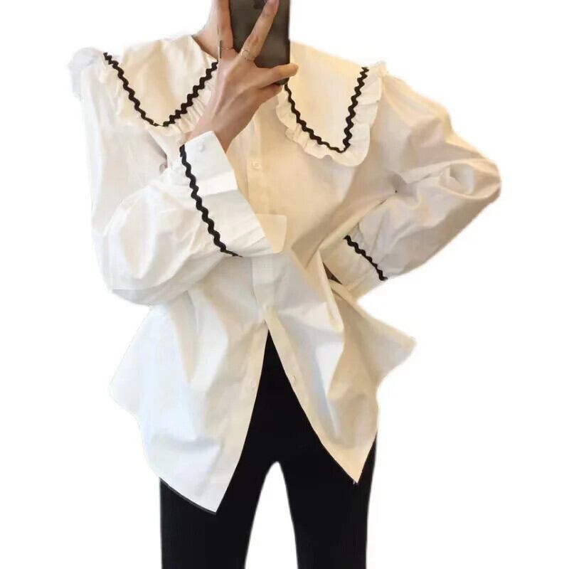 De Moda ルーズ長袖シャツコントラストネイビーカラートップブラウス白シャツウエスト ロング ホワイト