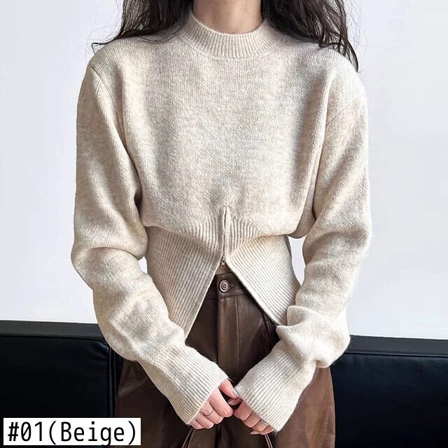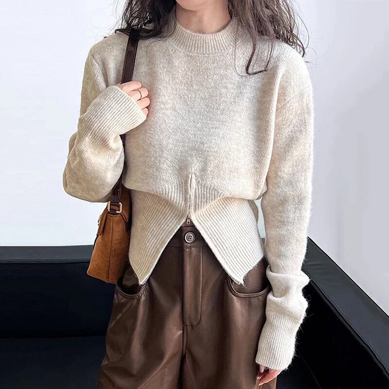 セータープルオーバーセーターデラウンドネックジッパールーズ長袖ニット無地グレー黒ニットトップ ロング ブラック Oネック ソリッドカラー