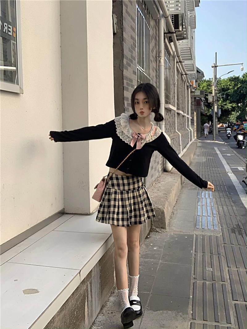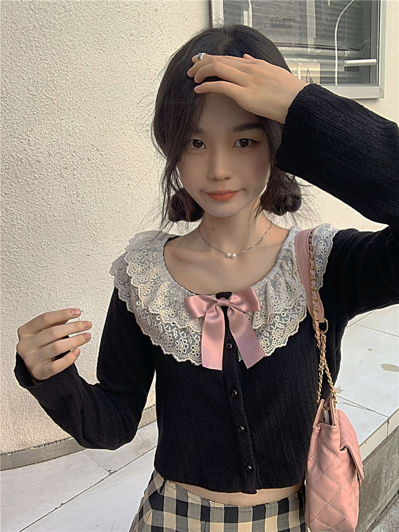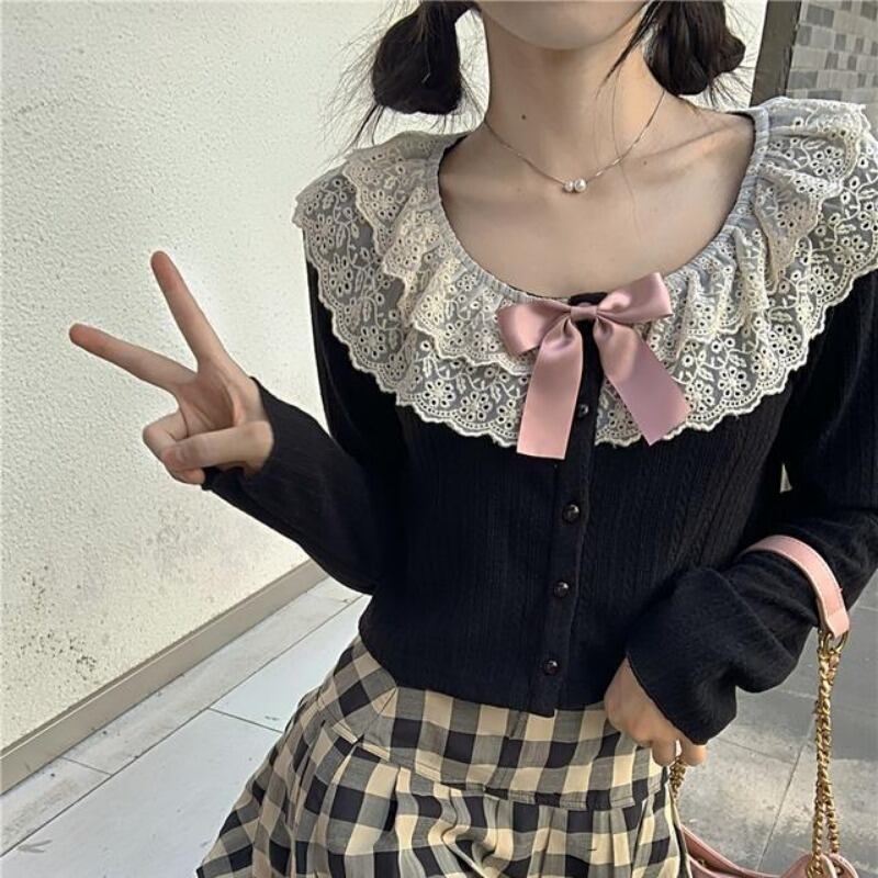 Y2k 美的ロリータレース O ネックレディースカーディガン長袖クロップトップススタイル弓パッチワーク Tシャツニット ロング リボン Oネック